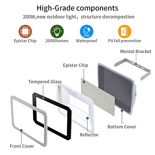 【Super Luminoso E Risparmio Energetico】200w faretti led esterno adottano utilizzano chip LED e la tecnologia sigillata per offrire un'illuminazione più brillante fino a 20000 lumen di luce. Eccellente sostituzione dei lampada alogena tradizionale da 500 W, risparmiando oltre l'85% dei costi dell'elettricità.