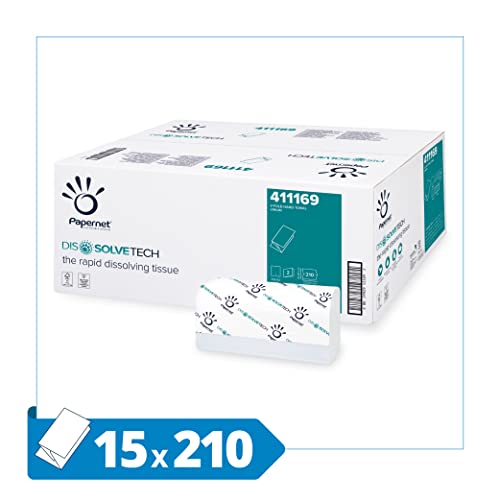 Papernet Dissolve Tech - Asciugamano Piegato a V 411169, 15 pacchi da 210 Pezzi Monouso di Carta in Pura Cellulosa, Biodegradabile e Altamente Resistente, 2 Veli, Dimensione Piegato 22x10,5cm