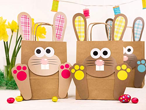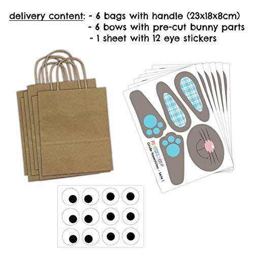 Riceverai 6 sacchetti di carta extra large per piccoli oggetti più grandi: in carta kraft marrone (22,5 x 18 x 8cm), 12 adesivi per gli occhi e 6 pagine DIN A4 pre-tagliate con dolci colorato coniglietto di Pasqua - (cartone per il fai da te da 300 g) per una facile rimozione