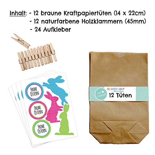 Papierdrachen 12 sacchetti per regali per la Pasqua fai da te e da riempire a piacere - Cestino pasquale fai da te con 12 sacchetti di carta e adesivi con coniglietto pasquale - Design 3