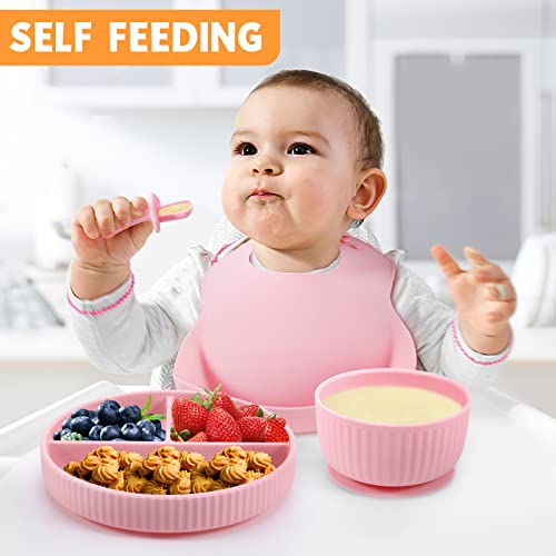 Set Pappa per Bambini Silicone Alimentare,7 Pezzi Set Svezzamento Silicone Piatto con Ventosa Ciotola Cucchiaio Forchetta Bavaglino,Antiscivolo Vassoio Senza BPA Impermeabili Set (Pink)