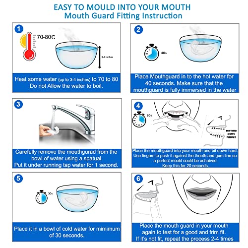 Personalizzabile: facilmente rifilato per adattarsi comodamente a qualsiasi dimensione della bocca, adulto o bambino di 12 anni o più. Ogni paradenti può essere adattato per adattarsi a un'ampia varietà di allineamenti dei denti, dimensioni dei denti e forme della bocca. La tecnologia Bolle e morsi può essere modellata a casa con acqua bollente. Semplici istruzioni passo passo incluse nella confezione. Può essere ri-bollito e ri-modellato più volte per la massima vestibilità. I canali di respirazione integrati rendono facile respirare mentre si indossa la guardia.