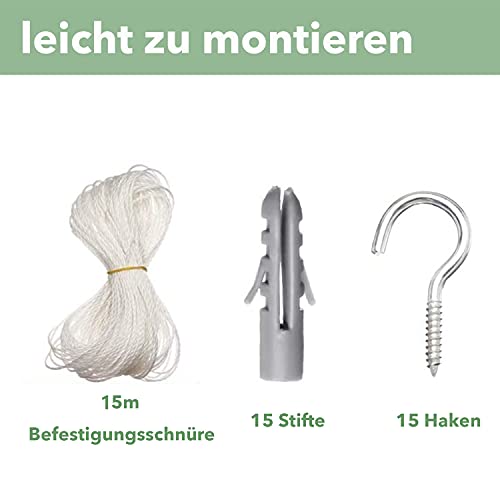 Facile da installare: forniamo 15 ganci, 15 perni, fili di fissaggio e istruzioni (lingua italiana non garantita). È possibile utilizzare i perni, i ganci e i fili di fissaggio secondo le istruzioni per installare la rete di protezione per gatti e godersi il balcone con il vostro gatto.