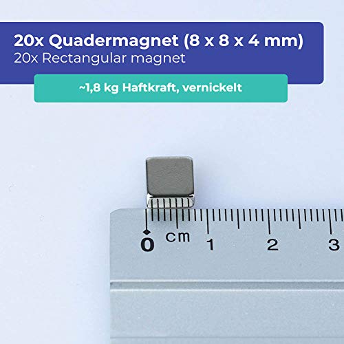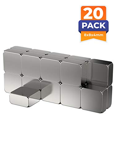 20 x Parallelepipedi magnetici neodimio | 8 x 8 x 4 mm | Nichelato (NiCuNi) | Forza di attrazione circa: ~ 1.8 kg | 20 pz. Parallelepipedo magnetico