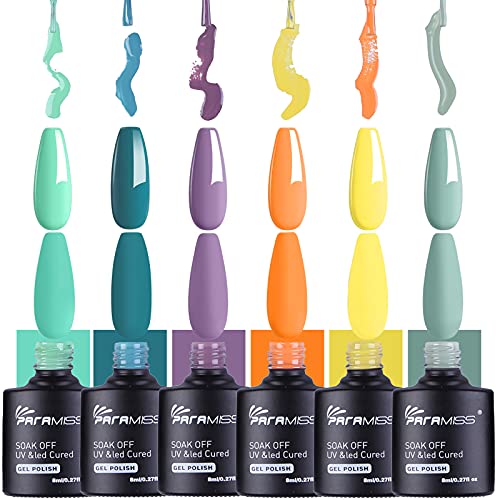 Colori smalto per unghie: il set di smalto per unghie PARAMISS include 6 gel UV per unghie (8 ml / bottiglia) verde corallo, colore blu inchiostro, viola, arancione, giallo, abbina i colori dello smalto gel verde.Adatto per tutte le stagioni, set di smalto per unghie gel UV . tutti possono scegliere il loro colore preferito per lo stile delle unghie fai-da-te, confezione di regali per le vacanze di capodanno per manicure per unghie.
