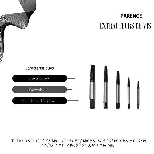 PARENCE.- Set di 5 estrattori a vite feriti, rotti e spogliati/kit di strumenti per la rimozione a spirale, varie dimensioni - 5 pezzi