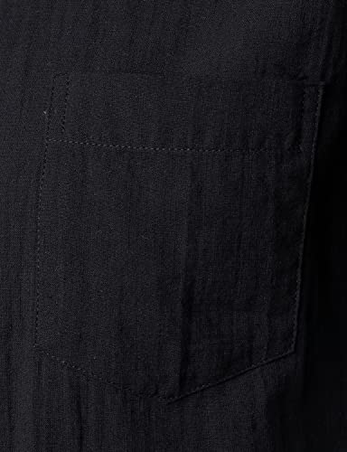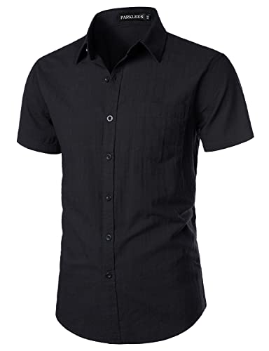 PARKLEES Camicia da uomo aderente in cotone e lino, casual, a maniche corte, con bottoni, leggera, da spiaggia, con tasca, Nero, XL