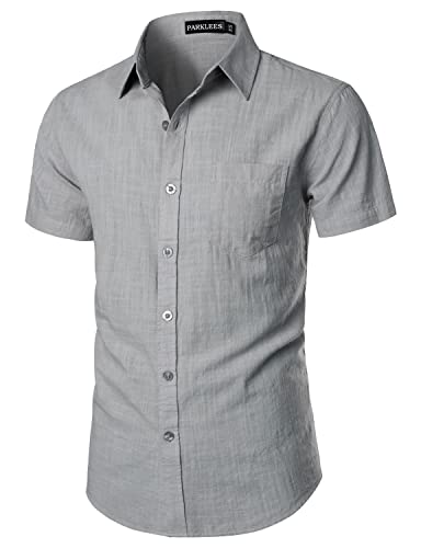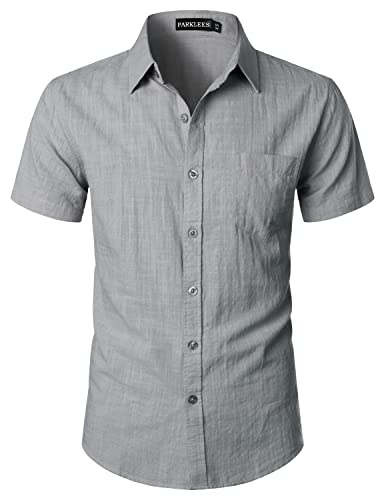 PARKLEES Camicia da uomo aderente in cotone e lino, casual, a maniche corte, con bottoni, leggera, da spiaggia, con tasca, Grigio, XL