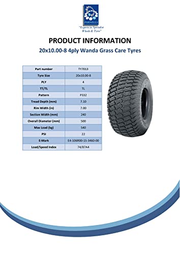 Parnells - 1 Pneumatico Tubeless per Tosaerba 20x10.00-8 - 4 Strati Wanda P332, Diametro 500 mm, Larghezza 236 mm, 540 kg Ciascuno a 22 psi - Spalla Arrotondata, non per Servizio High Way