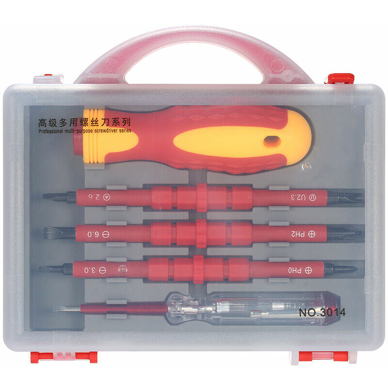 Questo è un set di strumenti di manutenzione professionale per elettricisti per eseguire diversi tipi di lavori di manutenzione, elettricità o altri lavori di riparazione. Non importa se fai riparazioni elettriche o solo riparazioni quotidiane in generale, questo set è un must per qualsiasi cassetta degli attrezzi tuttofare o elettricista. Caratteristiche: Impugnatura ergonomica per il massimo comfort e una coppia eccezionale .Include 6 diversi tipi di punte magnetiche per soddisfare le diverse esigenze di alimentazione. ed efficiente. br/> Viene fornito con una custodia trasparente, comoda da riporre e portatile per l'uso. Caratteristiche: Materiale: acciaio al cromo-vanadio (6150 CR-V ) + PP + TPR Trattamento superficiale: annerimento superficiale Il kit di cacciaviti include: Cacciavite a croce: P H0, PH2 Scanalato: SL3 mm, SL6 mm A forma di U: U2.3 Triangolo: 2.6 Test penna: AC 100-500 V, SL3 mm Misura penna: ca. 140*15 mm Dimensioni impugnatura: ca. 116*36 mm Cacciavite a 2 vie