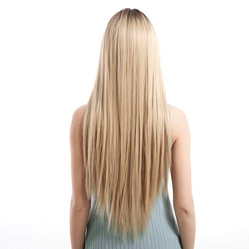 Parrucca diritta bionda, parrucca in pizzo sintetico per capelli ad alta temperatura in fibra ad alta temperatura, buona traspirabilità Radici scure Scoppi Lunga parrucca in seta bionda per donna