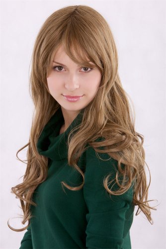 Parrucca da donna, capelli lunghi ondulati biondo scuro, con frangetta