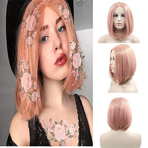Parrucca frontale in pizzo con taglio di capelli rosa rosa, 35,6 cm, colore rosa pastello sintetico parrucca rosa pesca capelli naturali senza colla media separazione resistente al calore