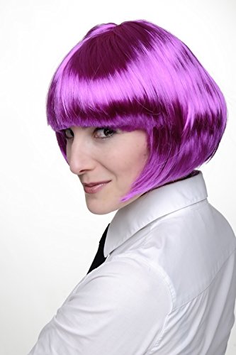 Parrucca da carnevale corta con taglio a caschetto di colore lilla-rosa.
