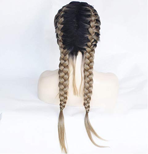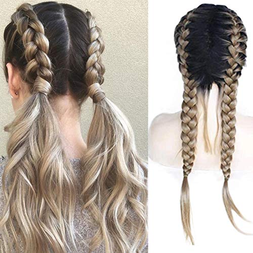 Parrucca con treccia bionda con radici scure doppia treccia capelli sintetici lunghi lisci con pizzo frontale per aggiungere una parte di tessitura umana con capelli di neonato trecce bionde da donna