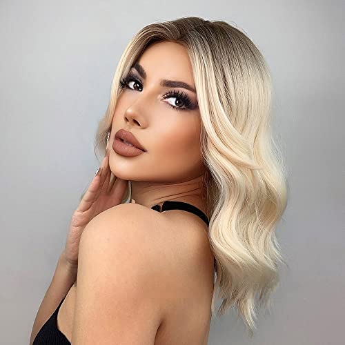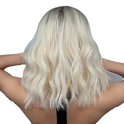 Parrucche corte biondo platino per donna, parrucca ondulata lunga fino alle spalle con capelli sintetici parte centrale a radici scure per cosplay di feste di Halloween quotidiane
