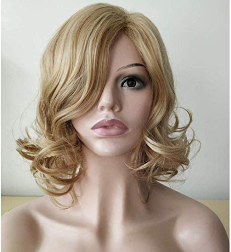Parrucche da Donna Capelli Corti Ricci Biondi Lunghezza Media Ondulato Sintetico con Frangia Cosplay Vestito da Travestimento da Donna Parrucche da Donna in Pizzo