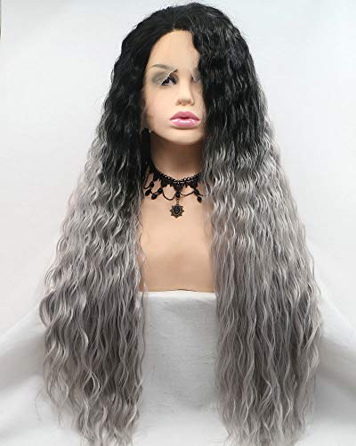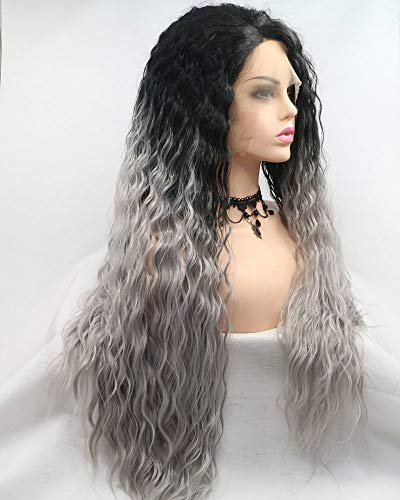 Parrucche lunghe e riccie nere a grigie con pizzo sintetico per ragazze e donne, feste, cosplay, attaccatura dei capelli naturale, 56 cm