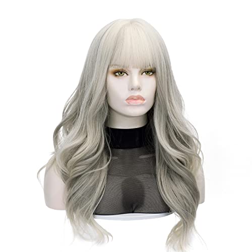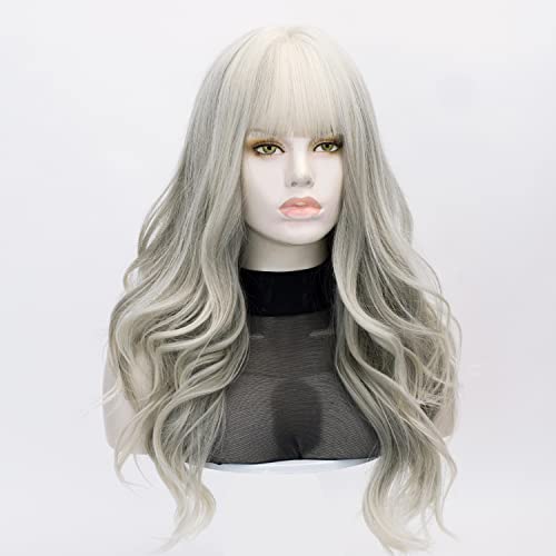 Parrucche ondulate ricci lunghe con frangia | FVCENT Parrucca bionda Ombre marrone per le donne Parrucche capelli lunghi ricci per parrucca da festa quotidiana (Biondo cenere misto)