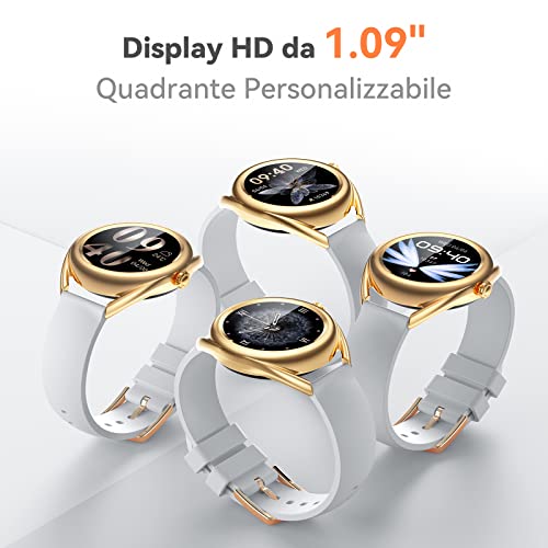 ASPETTO PICCOLO E ATTRAENTE: Progettato per le donne, uno smartwatch da donna semplice ma delicato, con uno schermo da 1,09" di dimensioni ridotte, più adatto al polso femminile. È ricoperto da una cornice decorativa in metallo dorato che lo rende alla moda e attraente. Un regalo perfetto per donne, fidanzate, mogli