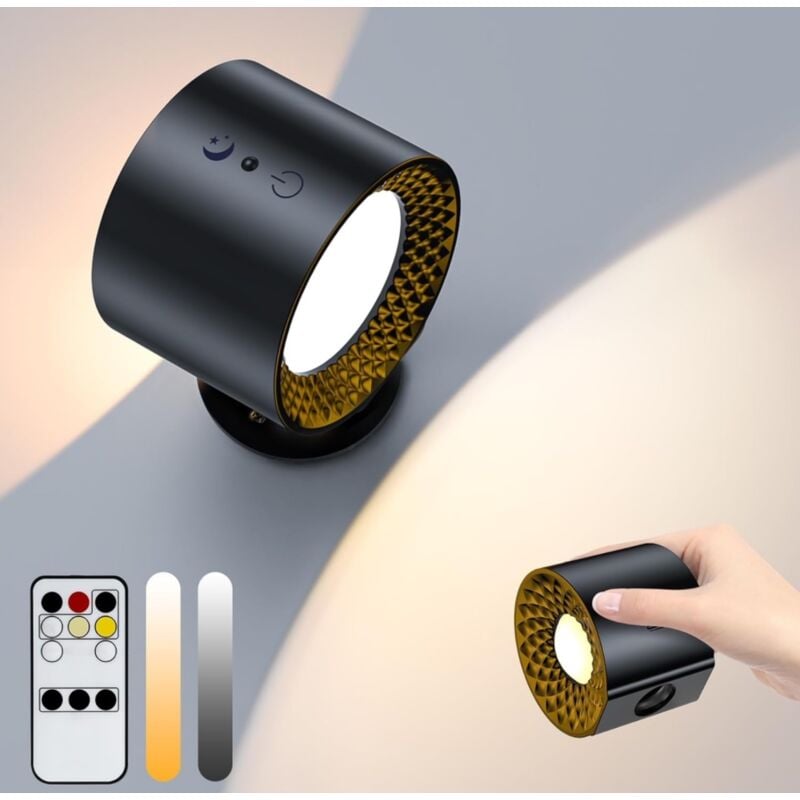 Applique Lampada doppio LED da parete a Batteria ricaricabile USB Controllo Touch o telecomando 3 Temperature CCT Rotazione di 360° Nero Illuminazione Versatile: Questo applique da parete offre opzioni di illuminazione adattabili per varie esigenze, come luce notturna, luce da lettura, luce di emergenza e decorazione, grazie alle 3 temperature della luce regolabili (calda, naturale, fredda). Doppia Luce LED: Con un design innovativo, questo applique dispone di una luce anteriore e una posteriore, fornendo un'illuminazione più intensa durante il giorno e una più morbida durante la notte. NOTA BENE: La luce posteriore, ovvero quella dall'intensità minore che viene utilizzata nelle ore notturne, non possiede funzione dimmer. Ricarica Rapida e Duratura: Dotato di batteria al litio da 1800mAh, questo applique si ricarica completamente in sole 3 ore e offre fino a 40 ore di autonomia alla minima luminosità e 5 ore alla massima. ersatilità di Utilizzo: Grazie alla sua base magnetica con