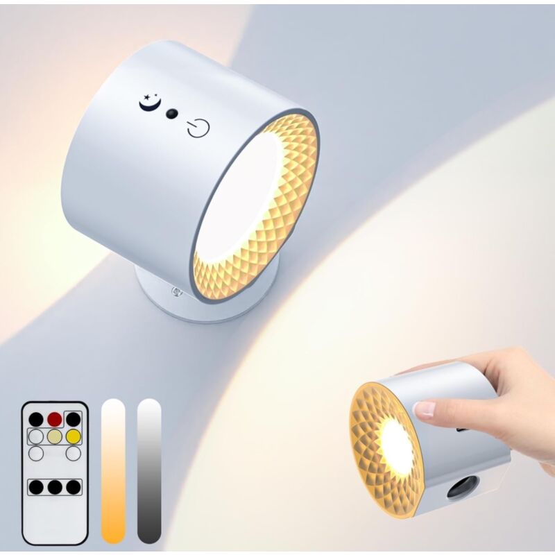 Applique Lampada LED da parete Luce Bifacciale a Batteria ricaricabile USB Controllo Touch o telecomando 3 Temperature CCT Rotazione di 360° Bianca Illuminazione Versatile: Questo applique da parete offre opzioni di illuminazione adattabili per varie esigenze, come luce notturna, luce da lettura, luce di emergenza e decorazione, grazie alle 3 temperature della luce regolabili (calda, naturale, fredda). Doppia Luce LED: Con un design innovativo, questo applique dispone di una luce anteriore e una posteriore, fornendo un'illuminazione più intensa durante il giorno e una più morbida durante la notte. NOTA BENE: La luce posteriore, ovvero quella dall'intensità minore che viene utilizzata nelle ore notturne, non possiede funzione dimmer. Ricarica Rapida e Duratura: Dotato di batteria al litio da 1800mAh, questo applique si ricarica completamente in sole 3 ore e offre fino a 40 ore di autonomia alla minima luminosità e 5 ore alla massima. ersatilità di Utilizzo: Grazie alla sua base