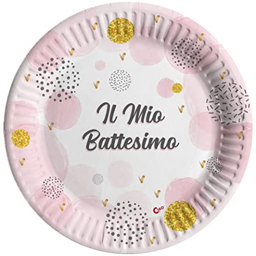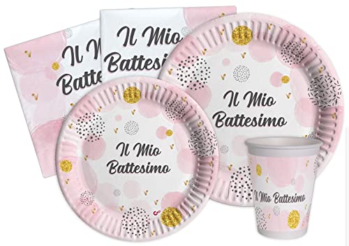 Kit Party Tavola Battesimo per 8 persone (44 pezzi: 8 piatti Ø23cm, 8 piatti Ø18cm, 8 bicchieri 200ml, 20 tovaglioli 33x33cm) in carta compostabile eco-friendly, rosa