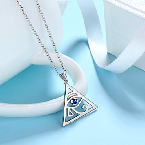 Questo ciondolo unico combina l'occhio mitologico di Horus in un triangolo, una moderna rappresentazione di New Age di conoscenza, illuminazione e vista. Il design è sicuramente ispirato all'immagine mostrata nell'Aleister Crowleys Autobiografia The Confessions of Aleister Crowley. Qualunque sia il simbolo per voi, sicuramente attirerà complimenti e conversazioni