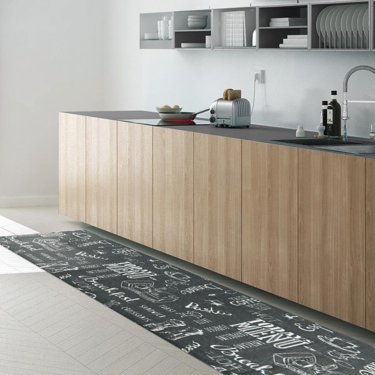 Tappeto stampato in 100% cotone, con fondo in dot lattice antiscivolo, disponibile in 6 formati. Tappeto Blackboard: Tappeto ideale per una cucina vintage e shabby chic. Resistente e funzionale, realizzato in cotone naturale, il dorso antiscivolo tiene fermo il tappeto, riducendo il rischio di scivolare.. Ideale per una cucina vintage e shabby chic. Facilmente lavabile a mano o in lavatrice a 30°