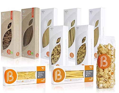 Il pacco comprende: 1 confezione di tagliolini all'uovo, 1 confezione di tagliatelle all'uovo, 1 confezione di trenette integrali bio, 1 confezione di fusilli integrali bio, 1 confezione di trenette, 1 confezione di fusilli, 1 confezione di spaghettoni, 1 confezione di calamarata, 1 confezione di pennoni, 1 confezione di spaghetti alla chitarra.