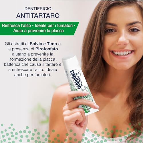 CONTENUTO - A casa riceverete un tubetto di dentifricio antitartaro da 75 ml di Pasta del Capitano. Gli estratti di Salvia e Timo e la presenza di Pirofosfato aiutano a prevenire la formazione della placca batterica che causa il tartaro e a rinfrescare l'alito. Ideale anche per fumatori. Dentifricio con Menta Biologica Certificata, 100% made in italy.