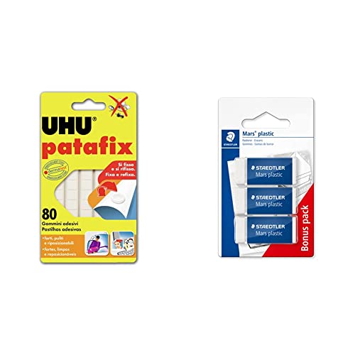 UHU Patafix 41710 - Gomma adesiva removibile, Bianco, confezione da 80 gommini & Staedtler Mars Plastic 526 53 Gomma, Bianco, 11 x 6.6 x 1.5 cm, Confezione Da Tre
