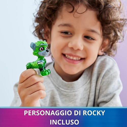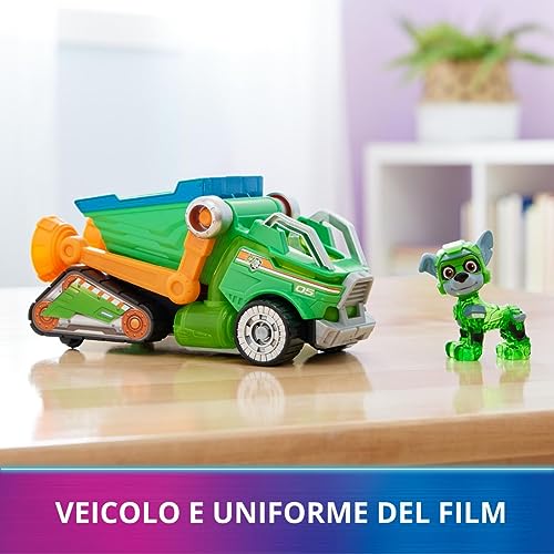 PERSONAGGI PAW PATROL DA COLLEZIONE: Con l'uniforme originale da Paw Patrol: Il Super Film, il personaggio di Rocky è unico nel suo genere. L'uniforme traslucida si illumina quando Rocky è a bordo del suo Camion dei Rifiuti