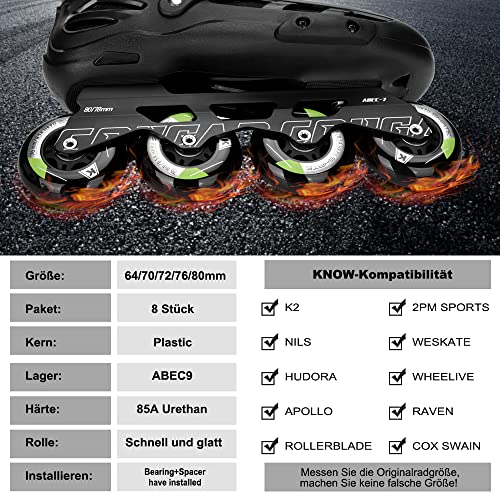 Pattini in linea 80 mm 76 mm 72 mm - 8 pezzi Inline Skate Ruote 85a in linea con cuscinetto a sfera ABEC9 | Pattini in linea per pattini K2 Hudora Gonex Apollo Inline Skate