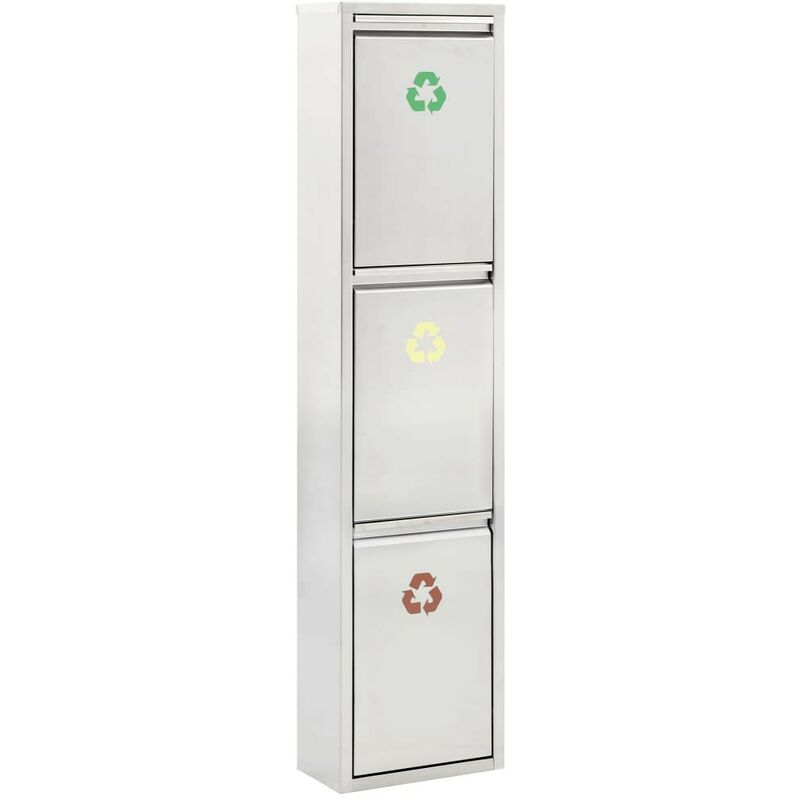 Comoda e igienica, questa pattumiera per la raccolta differenziata è perfetta per smaltire la spazzatura in casa o in ufficio in modo semplice e pulito. La pattumiera è dotata di 3 contenitori rimovibili per la raccolta differenziata. È possibile aprire o chiudere facilmente i secchi semplicemente premendoli. La superficie dei vari cestini è contraddistinta da colori diversi che rendono più facile suddividere la spazzatura. Il cestino ha un involucro in acciaio inossidabile con una finitura opaca, che conferisce al prodotto un aspetto elegante. I secchi interni, i coperchi e la base sono realizzati in resistente polipropilene (PP). Una volta chiusa, la pattumiera impedisce la diffusione di odori sgradevoli. Ogni secchio interno è dotato di una grande maniglia e può essere rimosso facilmente. Il design a colonna consente di risparmiare spazio. Colore: Argento Materiale: Involucro esterno in acciaio inossidabile + secchi interni, coperchi e base in polipropilene (PP) Dimensioni: 28,5 x