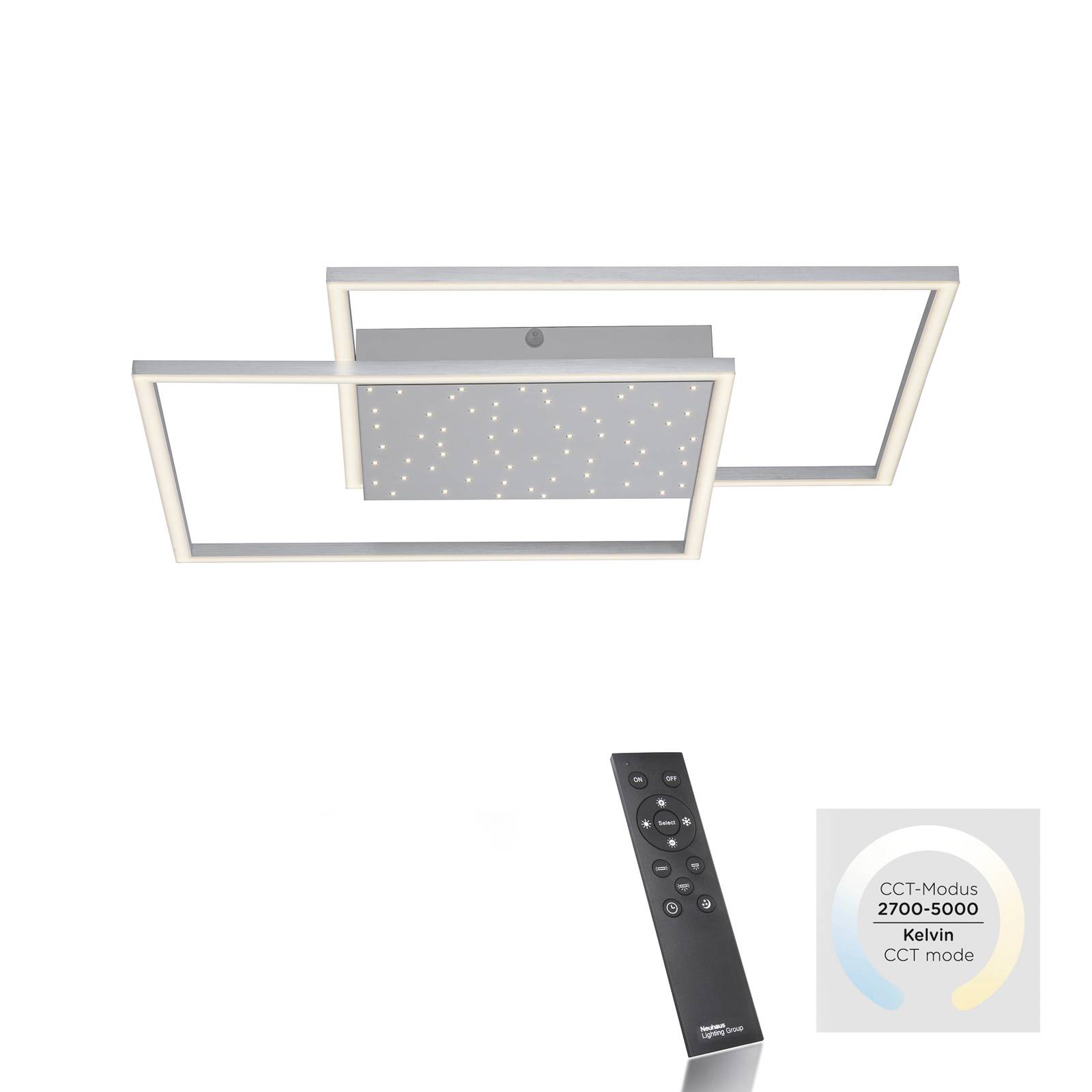 Plafoniera a LED Yuki in forma angolare con telecomando e cielo stellato La plafoniera a LED Yuki, dal design angolare, è composta da due sottili cornici rettangolari con schede LED che brillano all'interno e una parte centrale quadrata con un cielo stellato a LED. Le due fonti di luce, la cornice e il cielo stellato, possono essere accese indipendentemente l'una dall'altra o illuminate simultaneamente. Grazie alla gestione della luce CCT, tutte le aree dell'apparecchio possono essere regolate nel colore della luce da bianco caldo a bianco universale e l'illuminazione può essere dimmerata. Queste impostazioni variabili dell'apparecchio, che possono essere comodamente regolate con il telecomando, consentono di adattare l'illuminazione a qualsiasi situazione, sia in soggiorno che in altre aree.