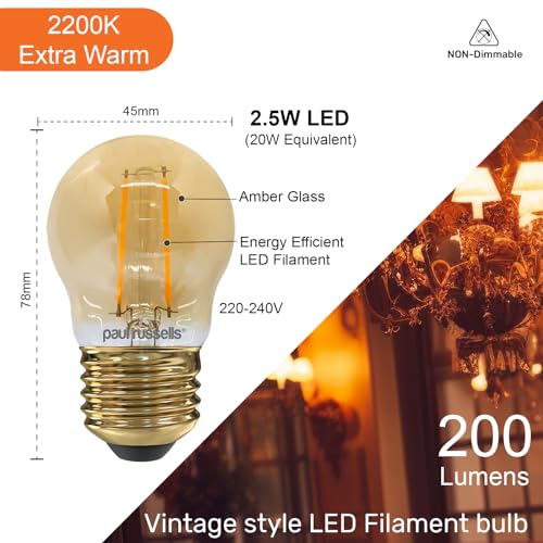 Paul Russells 3 confezione da 2 W = 25 W Golf filamento LED ambra lampadine E27 2 W Edison ES Small Globe G45 360 Beam lampada 2200 K bianco extra caldo 25 W ad incandescenza