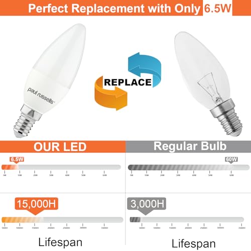 Paul Russells - Lampadine LED 7W (equivale a 60W) SES / E14, attacco a vite piccolo, modello C37, angolo di fascio 270°, ricambio equivalente di lampadine ad incandescenza da 60 W, bianco caldo, confezione da 2