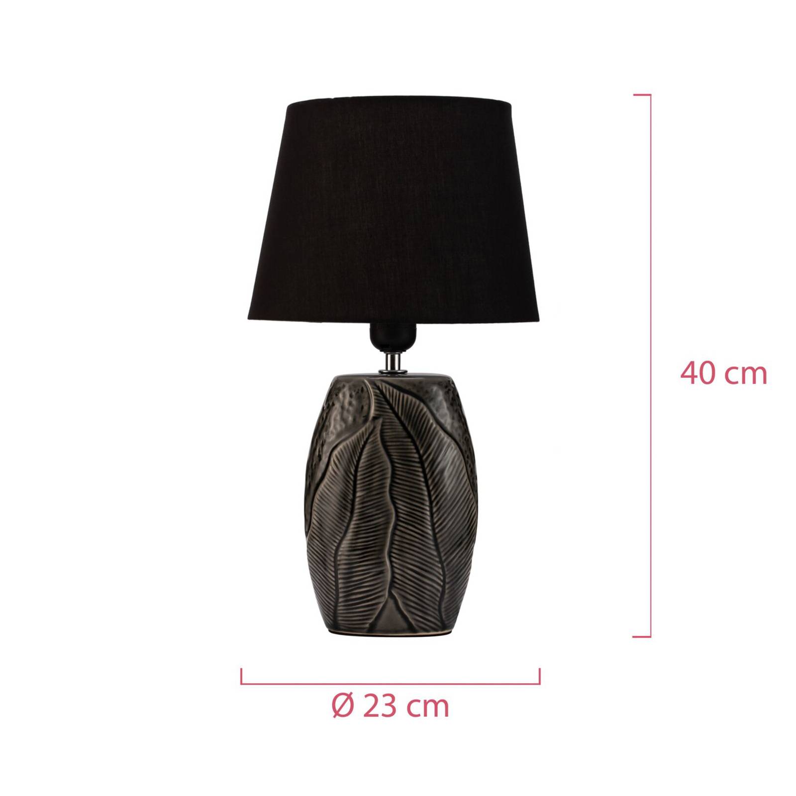 Midnight Dream lampada da tavolo tutta in nero - base in ceramica e paralume in tessuto La lampada da tavolo Midnight Dream si presenta completamente in nero. La sua base in ceramica incanta con un motivo decorativo a forma di lunghe foglie. Il paralume in tessuto nero, che sta sopra di esso con una piccola distanza, permette ad un'illuminazione morbida di penetrare nella stanza, mentre la luce dell'illuminante si irradia più luminosa dalla parte superiore e inferiore del paralume, crea bei coni di luce e mette in scena decorativamente il piede.