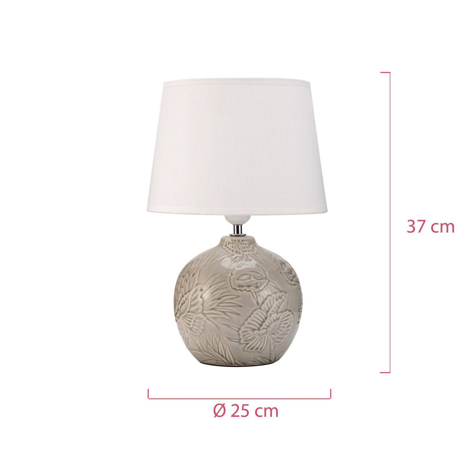 Tender Love lampada da tavolo con motivo floreale su base in ceramica Il paralume bulboso della lampada da tavolo Tender Love in ceramica in grigio è disegnato tutto intorno con un motivo floreale che emerge vividamente sul paralume lucido. In combinazione con il paralume bianco di forma leggermente conica in tessuto, si crea una lampada da tavolo piena di armonia che diventa una decorazione in soggiorno o in camera da letto quando è spenta e si adatta a qualsiasi interno.