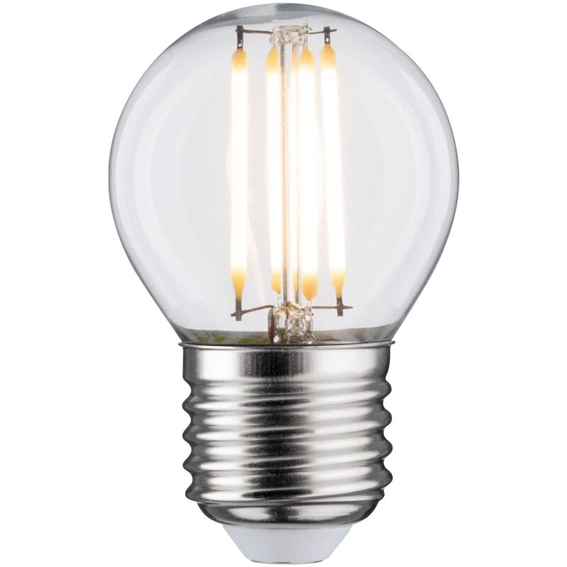 La lampadina a goccia a filamento con una potenza di 4,8 watt emana la sua luce bianco caldo in tutte le direzioni. Le lampadine a goccia hanno una forma compatta che le rende perfette per gli apparecchi di piccole dimensioni. Il colore della luce è un piacevole bianco caldo e la lampadina è compatibile con tutti i portalampade e27 disponibili in commercio.