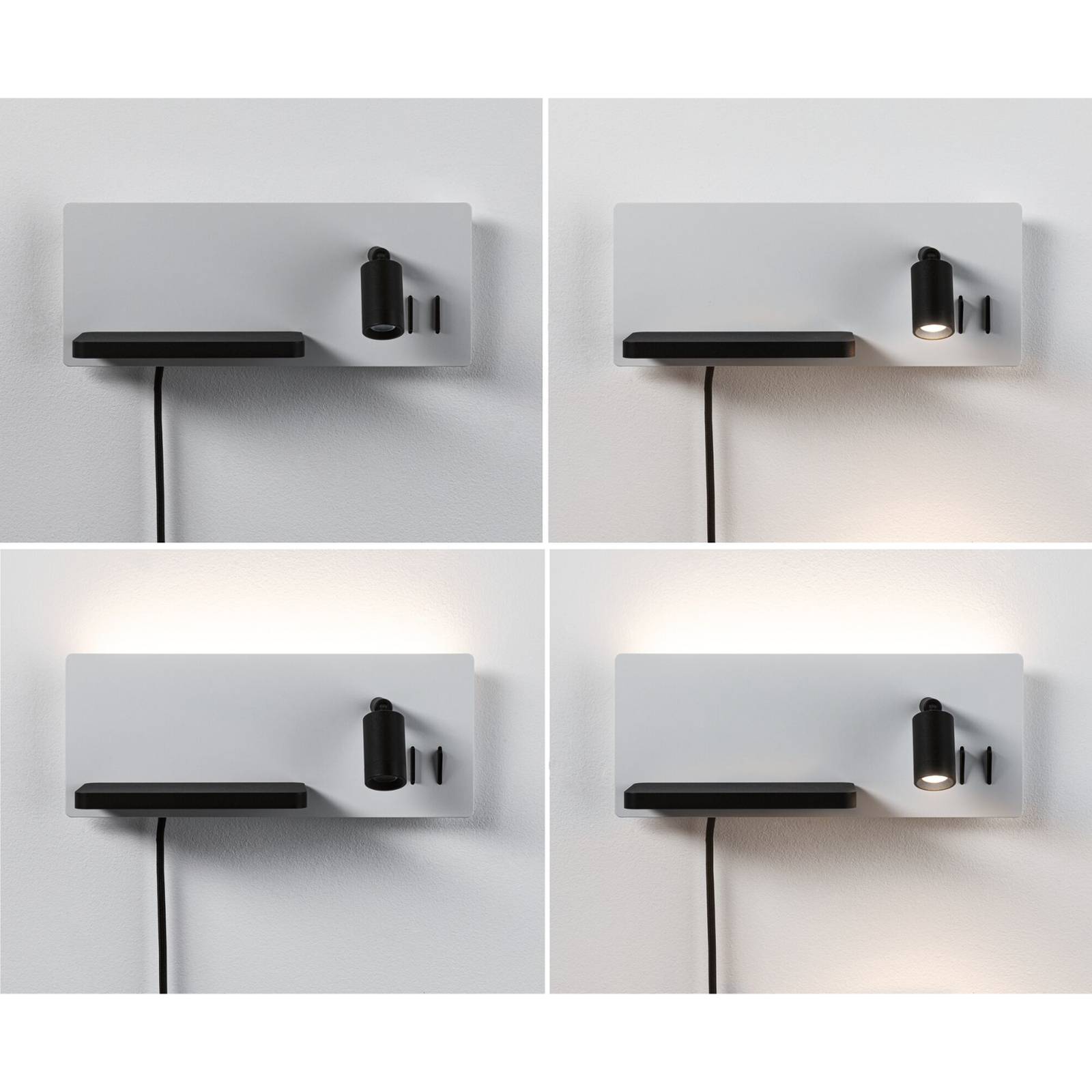 Lampada da lettura Serra LED con connessione USB e superficie di appoggio La lampada da lettura a parete Serra LED da montare a lato del letto, in un moderno look bianco e nero, unisce estetica e funzionalità per creare un ambiente piacevole. Grazie alla presa di ricarica USB Type-C sul lato per una ricarica rapida e alla pratica superficie di appoggio per il cellulare, offre anche un valore aggiunto consentendo di ricaricare lo smartphone o il tablet direttamente sull'apparecchio. La testa dell'apparecchio orientabile, che assomiglia a un piccolo faretto, fornisce un'illuminazione flessibile ideale per la lettura. Inoltre, l'apparecchio è dotato di una retroilluminazione regolabile in tre fasi, che consente di ottenere una luce d'ambiente discreta sulla parete. La lampada da lettura a parete Serra è ideale per essere collocata accanto al letto ed è disponibile in versione destra e sinistra. Un interruttore di accensione/spegnimento sull'apparecchio consente un facile utilizzo sul posto - apparecchiatura pronta per l'uso con cavo tessile di alta qualità (staccabile, in modo da consentire anche il collegamento diretto)