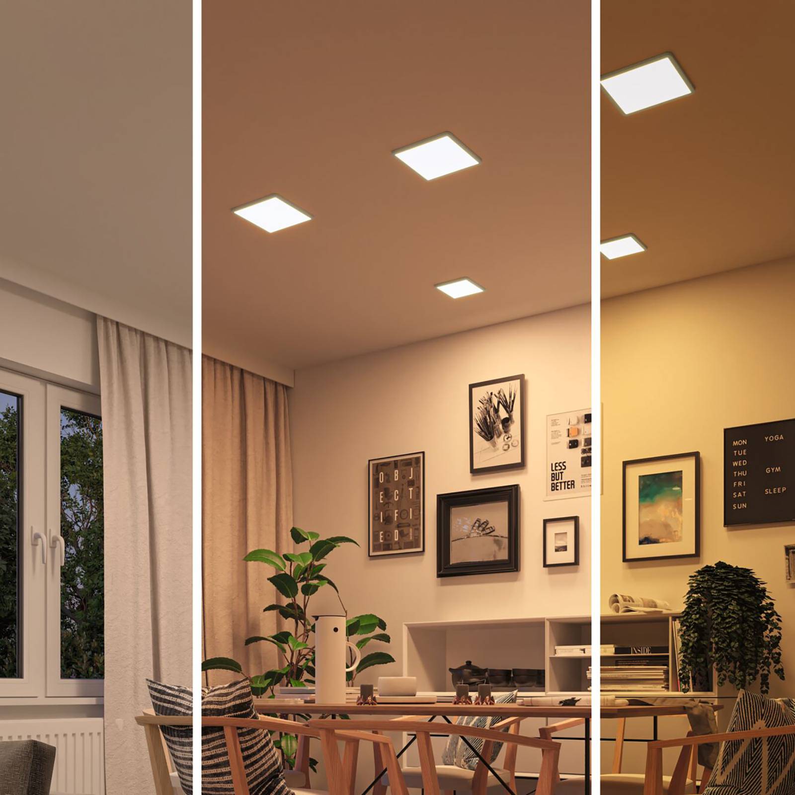 Pannello LED da incasso Areo quadrato e incorniciato - triplo cambio di colore della luce tramite interruttore a parete Grazie alla tecnologia dim-to-warm a 3 fasi, è possibile impostare il colore della luce e la dimmerazione simultanea esclusivamente tramite l'interruttore a parete esistente senza ulteriori strumenti. Questa tecnologia rende il pannello da incasso particolarmente adatto ad ambienti che vengono utilizzati in modo diverso. Qui la pratica postazione di lavoro può essere facilmente combinata con la zona giorno e relax, poiché Areo consente tre modalità di illuminazione, come il bianco universale di fatto con una luminosità del 100 %, il bianco caldo con 3.000 K e una luminosità del 50 % e l'accogliente bianco caldo con 2.000 K e una luminosità del 25 %. L'apparecchio da incasso piatto con cornice in plastica si fonde quasi con l'ambiente circostante e ha un aspetto estremamente moderno e chic nonostante la sua forma classica. - adatto a vari diametri di installazione grazie alle clip a molla scorrevoli sul retro - Utilizzabile anche per ambienti umidi come bagni, cantine, esterni