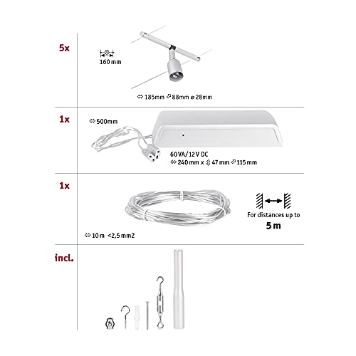 Paulmann CorDuo, sistema di cavi per faretti, 94442, set Salt, massima CC 5 pezzi da 10 Watt l'uno, estensibile, cromato, opaco, cavi, in plastica, GU 5,3, senza lampadine