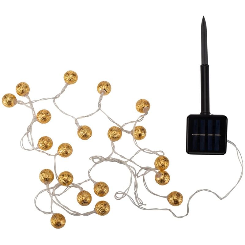 La catena luminosa solare Sunshine Glamour in color oro immerge le lunghe notti d'estate in una luce decorativa con 20 sfere in metallo illuminate dal design orientale e pregiato! Il modulo solare della catena luminosa si ricarica di giorno alla luce del sole. Al crepuscolo, la luce si accende automaticamente. La durata dell'illuminazione è fino a 8 ore al giorno e crea un'atmosfera accogliente in balcone o in giardino. Inserisci il modulo solare nel terreno in un punto ben illuminato dal sole. La catena luminosa è particolarmente decorativa in un vaso, in una recinzione o in un cespuglio. Non devi preoccuparti della presa più vicina, poiché grazie al modulo LED la catena luminosa si può posizionare in modo flessibile. Scegli tra due modalità di illuminazione: Continua o a intermittenza. Le catene luminose solari hanno molti vantaggi: sono perfetti per il balcone o il giardino, si possono posizionare in modo flessibile grazie alla tecnologia solare, hanno una batteria sostituibile e