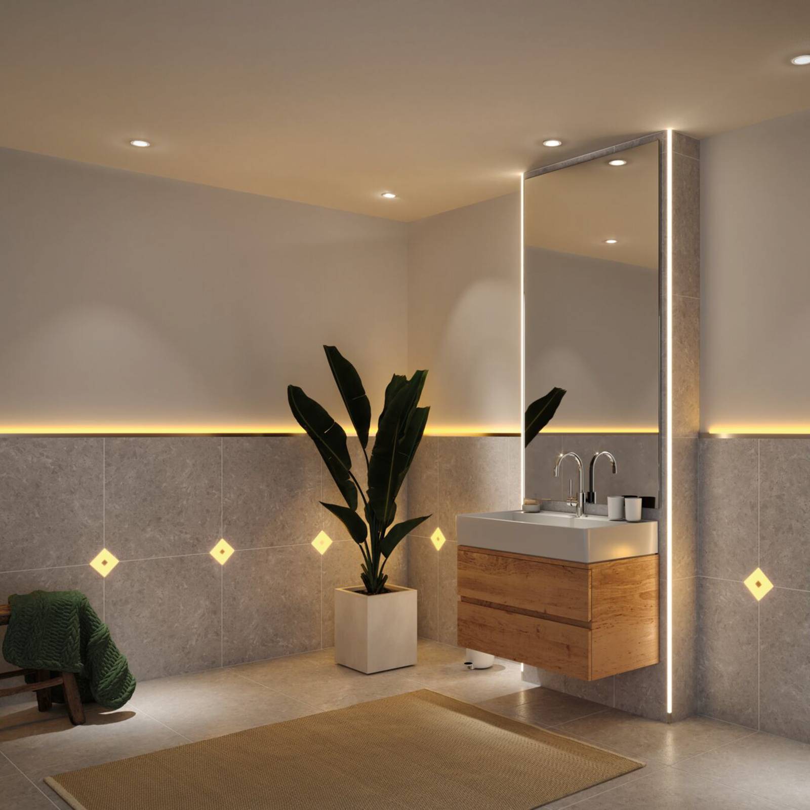 Interruttore a parete LumiTiles Touch Module Square per il controllo delle piastrelle LED LumiTiles, ZigBee, IP44Con il LumiTiles Touch Module Square è possibile controllare le lampade da incasso a LED LumiTiles, che sono piastrelle LED. Il modulo si integra in uno specchio di piastrelle allo stesso modo delle piastrelle LED, il che è facile grazie alle dimensioni adatte (10 x 10 cm) e alla ridotta profondità di installazione.Per il funzionamento del modulo è assolutamente necessario un set di base LumiTiles di Paulmann con due o cinque piastrelle LED, che viene alimentato tramite il trasformatore incluso in entrambi i set. Una volta che tutto è stato installato e collegato, le piastrelle LED possono essere commutate e dimmerate in modo continuo tramite il pannello di controllo a sfioramento del modulo. Inoltre, è possibile regolare il colore della luce.Caratteristiche tecniche / compatibilità- per il controllo (commutazione, oscuramento, cambio di colore) delle piastrelle LED LumiTiles (vedere accessori)- compatibile con ZigBee 3.0- frequenza radio: 2,4 GHz- portata radio: 25 m- integrabile negli specchi delle piastrelle grazie alla ridotta profondità di installazione (10 mm)- protetto contro gli spruzzi d'acqua (IP44)- facile da collegare grazie al Plug