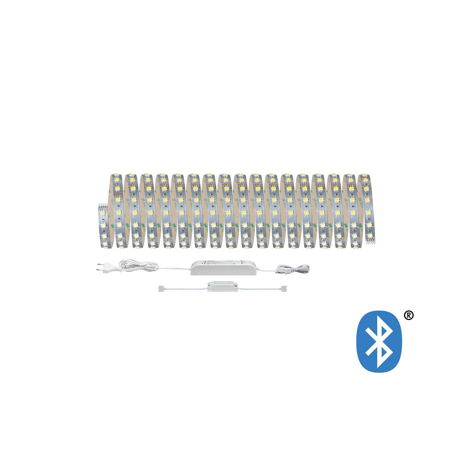 Striscia MaxLED 500 LED, pratico set di base in 10 m di lunghezza e con funzione Tunable White La striscia LED della serie MaxLED di Paulmann, che può essere controllata via Bluetooth, copre un'ampia area del soggiorno con una luce efficiente. Grazie alla funzione Tunable White integrata, puoi scegliere tra la luce bianca calda per riunioni accoglienti e la luce del giorno per ore di lavoro efficaci. La striscia viene fornita con un controller di oscuramento/ commutazione che può essere controllato via Bluetooth per la commutazione e l'oscuramento. A seconda di dove la striscia viene installata, può fornire luce diretta o indiretta e mettere abilmente in evidenza le aree e gli oggetti desiderati. - Può essere controllato con l'app gratuita Paulmann Home per Android o iOS tramite Bluetooth 4.0 o superiore. - in alternativa controllabile con il telecomando Paulmann Bluetooth Boss (vedi accessori) - Set completo che include striscia, alimentatore e regolatore bianco sintonizzabile - Parte posteriore adesiva per una facile installazione e può essere accorciata come richiesto - Tunable White - controllo della luce bianca dal bianco caldo (3.000 K) alla luce del giorno (6.500 K) - Estendibile fino a max. 20 m - non compatibile con YourLED