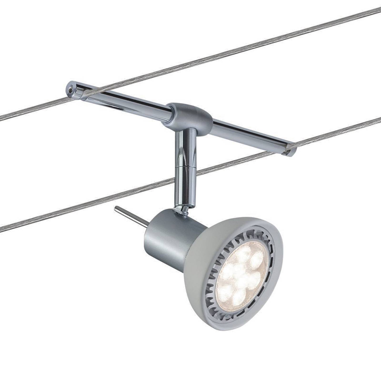 Sistema di cavi Sheela come set base a cinque fiamme in cromo opaco con vetro opalino Sheela è un sistema a filo pronto per il collegamento che viene fornito come set completo composto da trasformatore, filo e cinque apparecchi con tonalità di vetro semicircolare. Il sistema offre possibilità di design illimitate e può essere montato sia sul soffitto che su una parete o su un tetto inclinato. I paralumi in vetro satinato sono dotati di prese GU5.3 che possono essere equipaggiate con una lampadina a LED.