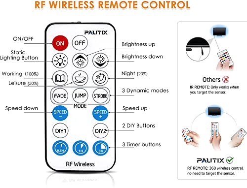 【Multidirezionale】 Il telecomando RF è multidirezionale, non è necessario puntare direttamente verso il ricevitore come il telecomando IR, puoi controllare la tua striscia LED da qualsiasi angolazione (la batteria CR2025 da 3 V è inclusa).