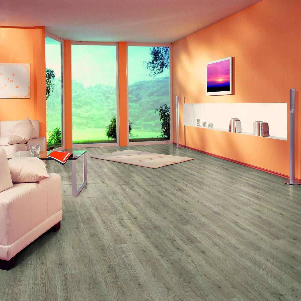 Pavimento laminato in HDF, colore grigio. Rendere più moderna la casa con un pavimento facile da posare e che permetta, in caso di usura o di problemi su alcune doghe, di poterle sostituire. Non richiede trattamenti di lucidatura, ceratura o levigatura. Il pavimento si adatta ad essere smontato, sostituito o riutilizzato, senza rovinare la vecchia superficie
